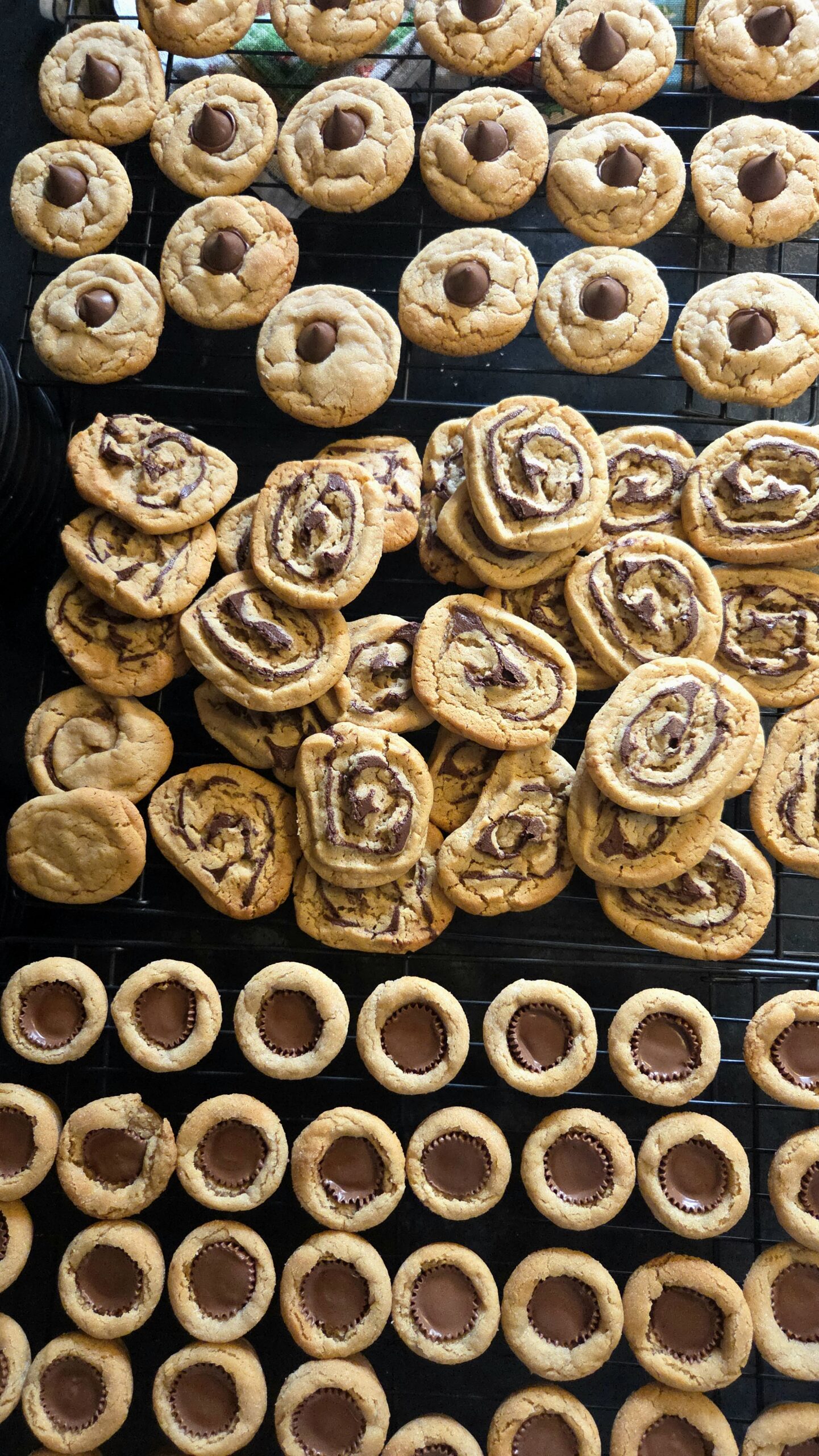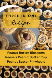 This recipe is for one batch. To make all three cookies, peanut butter blossoms, reese’s peanut butter cup cookies and peanut butter pinwheels, make a triple batch of the peanut butter cookie dough.