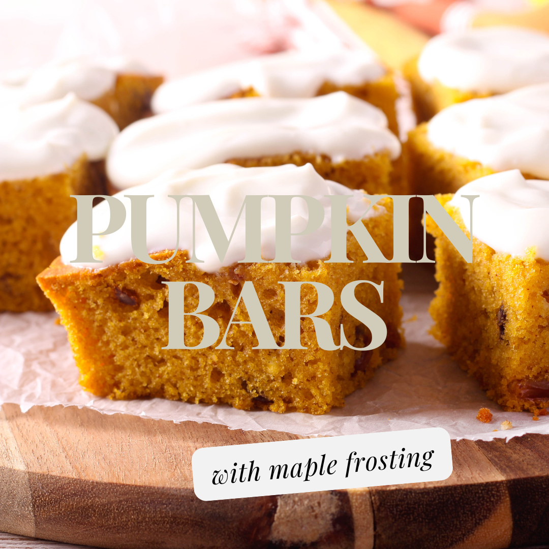 Pumpkin Bars with Maple Cream cheese Frosting! Bursting with the warm, comforting flavors of pumpkin spice with a subtle hint of maple these bars are the ultimate autumn treat. Amazingly moist and topped with a creamy, dreamy maple frosting, they are sure to be a hit at any gathering. Get ready to fall in love with your new favorite fall dessert! Psst I promise your friends will want this recipe, and it is heirloom quality. Grandmas old fashioned recipe with a maple twist to make it irresistible!